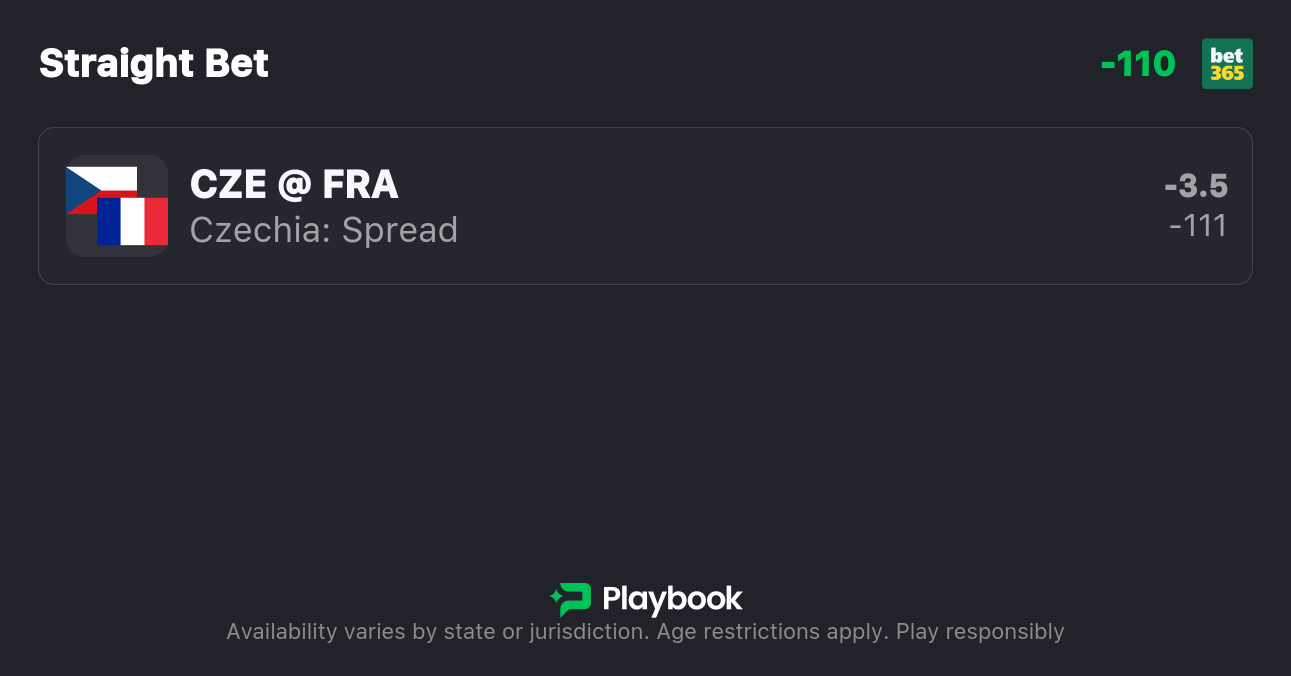 - Czechia vs. France Moneyline: Czechia -1667, France +950
