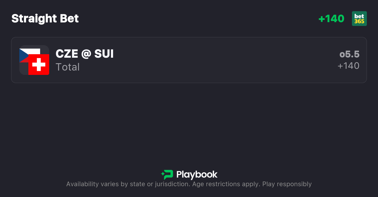 - Czechia vs. Switzerland Moneyline: Czechia -140, Switzerland +120