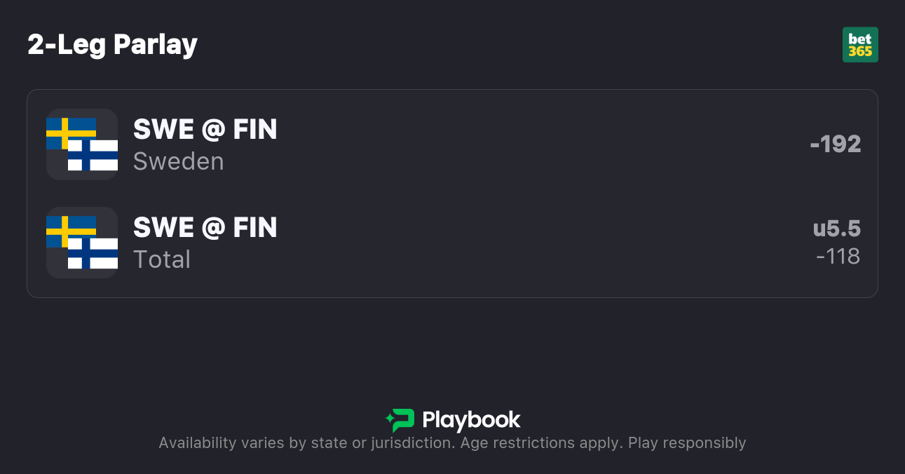 - Finland vs. Sweden Moneyline: Finland +160, Sweden -193