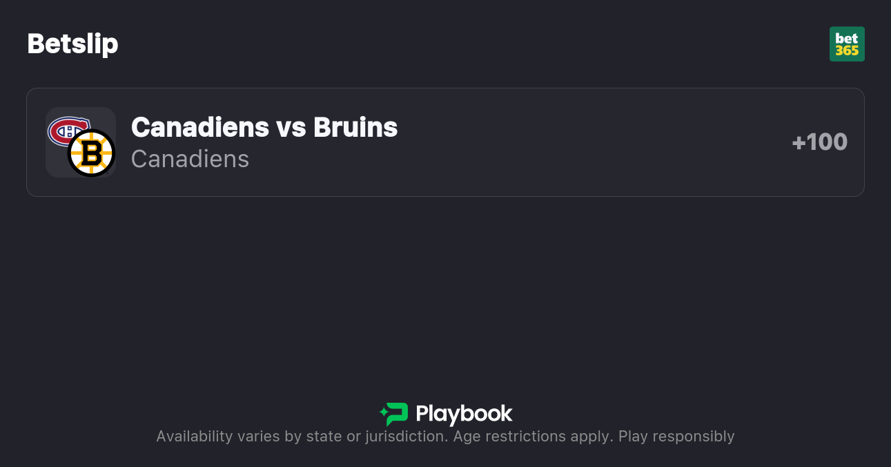 - Canadiens vs. Bruins Moneyline: Canadiens +100, Bruins -120