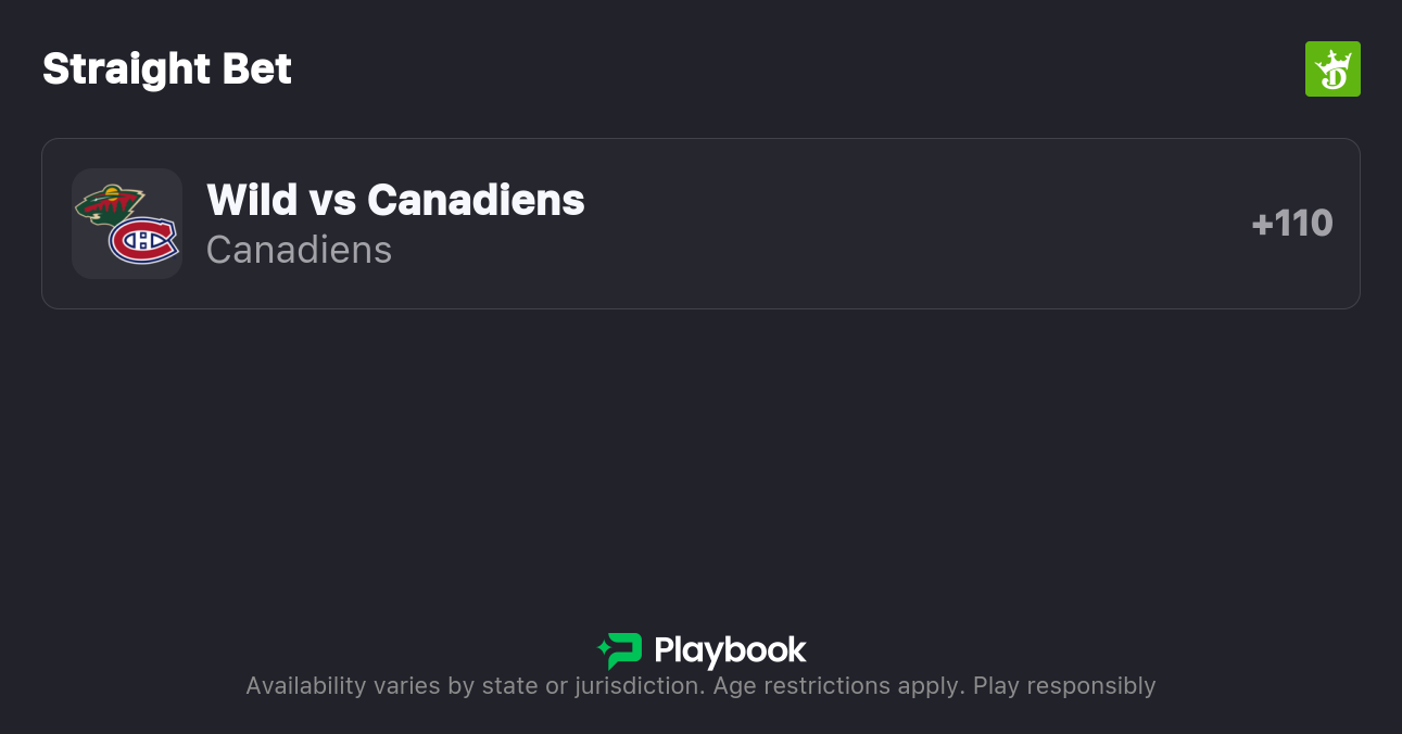 - Canadiens vs. Wild Moneyline: Canadiens +110, Wild -132