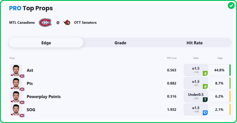 Action PRO projects Canadiens center Nick Suzuki for 0.56 assists against the Senators tonight, giving us an amazing 44.8% edge against the market when compared to his current prop line of over/under 1.5, which marks the Under with an A+ grade in our system.