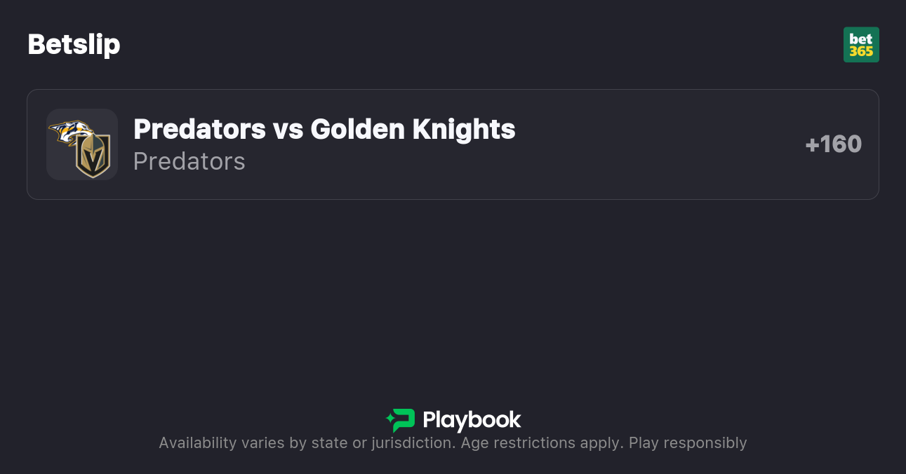 - Predators vs. Golden Knights Moneyline: Predators +160, Golden Knights -190