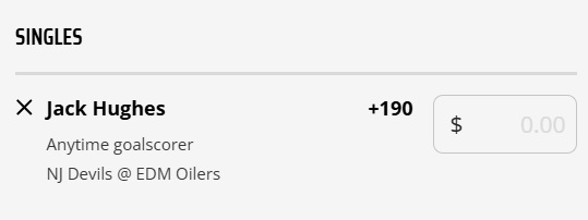 Pick: Jack Hughes Anytime Goalscorer +190 (DraftKings, Play to +170)