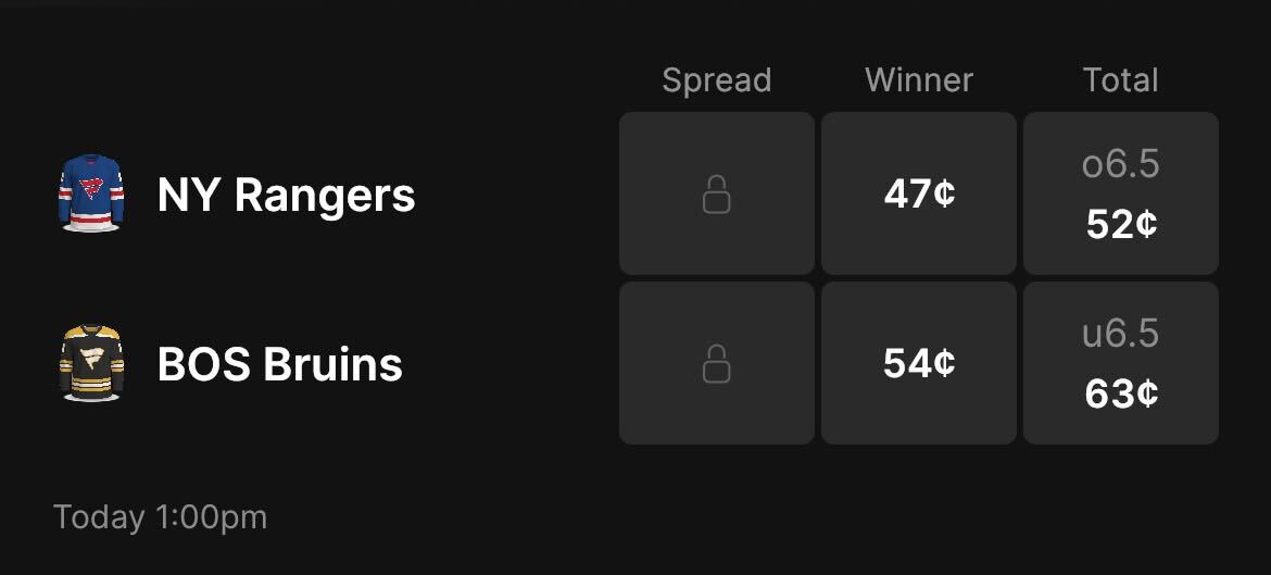 - Rangers vs. Bruins Moneyline: Rangers 47-cents, Bruins 54-cents