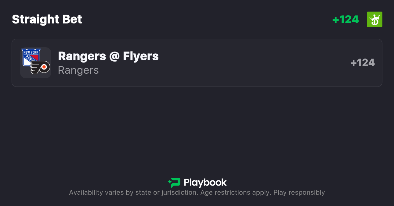 The Flyers are favored by -1.5 on the puck line, with the over/under set at 5.5 (-112o / -108u). The Flyers are a -145 favorite to win outright, while the Rangers are +120 to pull off the upset.