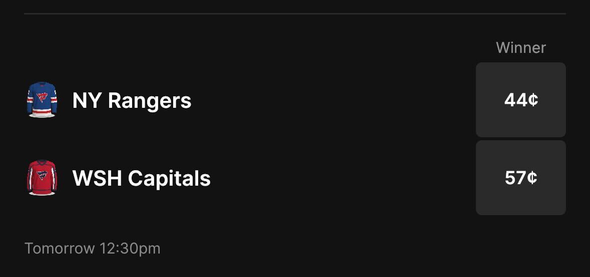 The Capitals are favored by -1.5 on the puck line, with the over/under set at 5.5 (-120 / +100). The Capitals are a 57-cent favorite to win outright, while the Rangers are 44-cent to pull off the upset on Fanatics Markets.