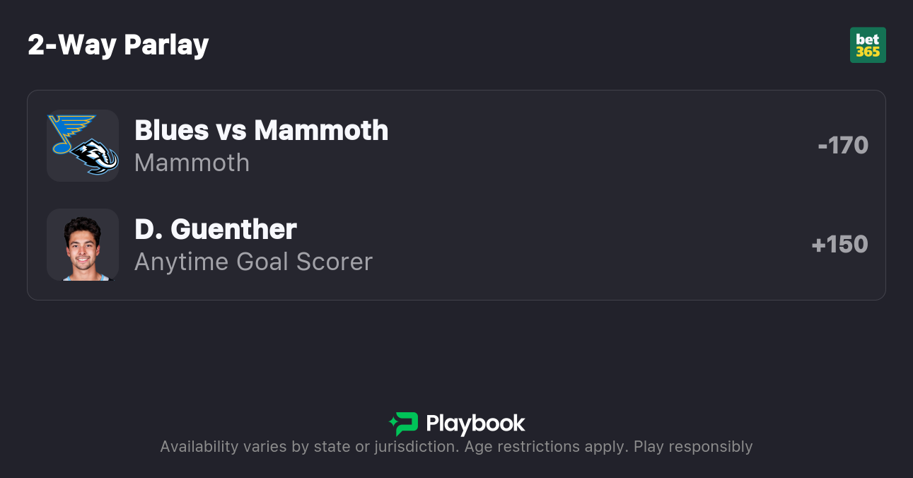I’m going to parlay this game. Utah’s moneyline is pretty steep for me, but I still feel confident in the Mammoth winning this game. While I’m also feeling confident on anytime goal scorers, I feel great about Guenther.