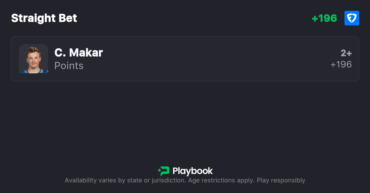 Based on Makar's recent offensive form in tougher matchups, FanDuel's +200 price for him to record two points Friday looks like great value.