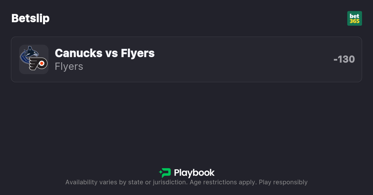 - Flyers vs. Canucks Moneyline: Flyers -132, Canucks +110