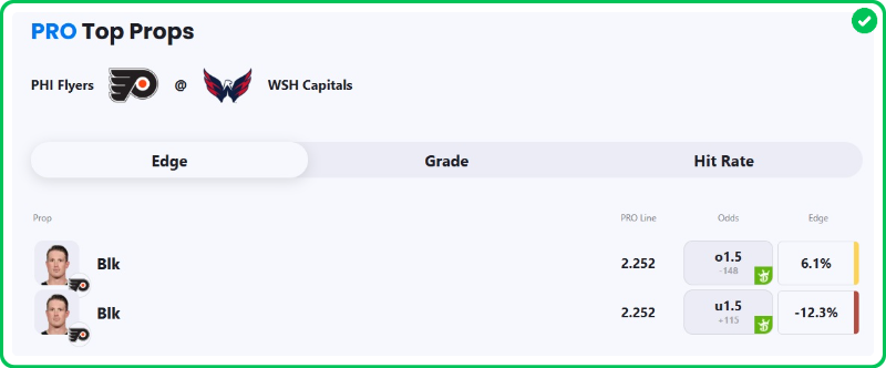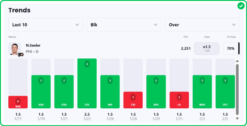 Action PRO projects Flyers defenseman Nick Seeler for 2.25 blocks tonight, an interesting 6.1% edge against the market when compared to his 1.5 line.