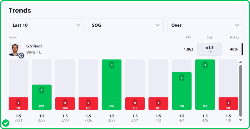 Vilardi has surpassed this 1.5 line in three of his last six games, with totals of 4, 3 and 4 shots on goal in those contests.
