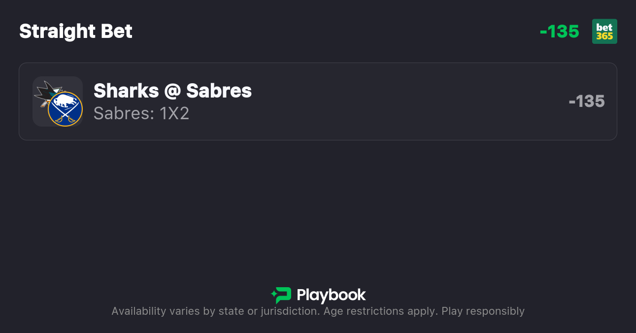 - Sharks vs. Sabres Moneyline: Sharks +165, Sabres -200