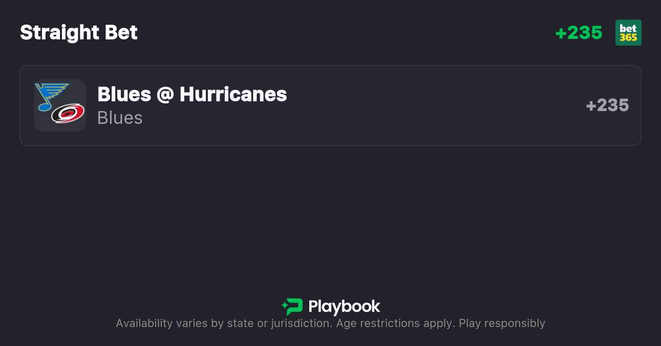 Blues vs. Hurricanes Moneyline: Blues +232, Hurricanes -288