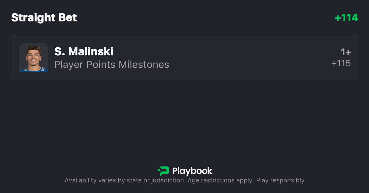 Pick: Sam Malinski Over 0.5 Points +115 (Play to +105)