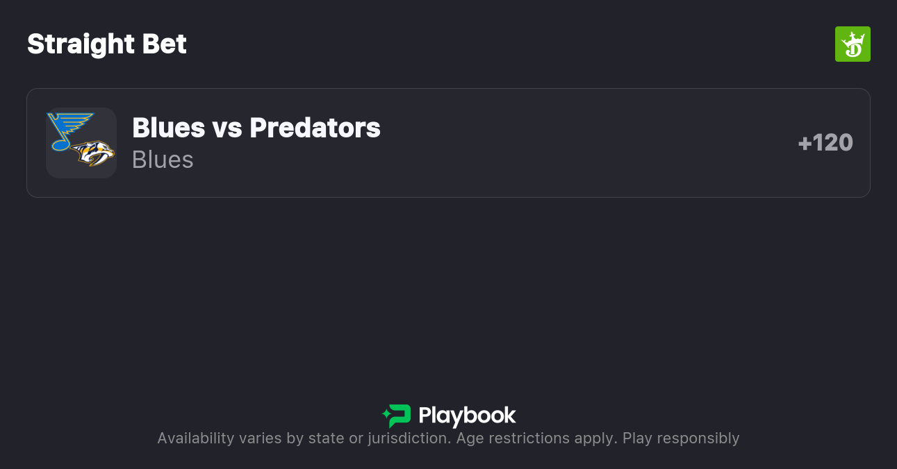 Blues vs. Predators Moneyline: Blues +120, Predators -143