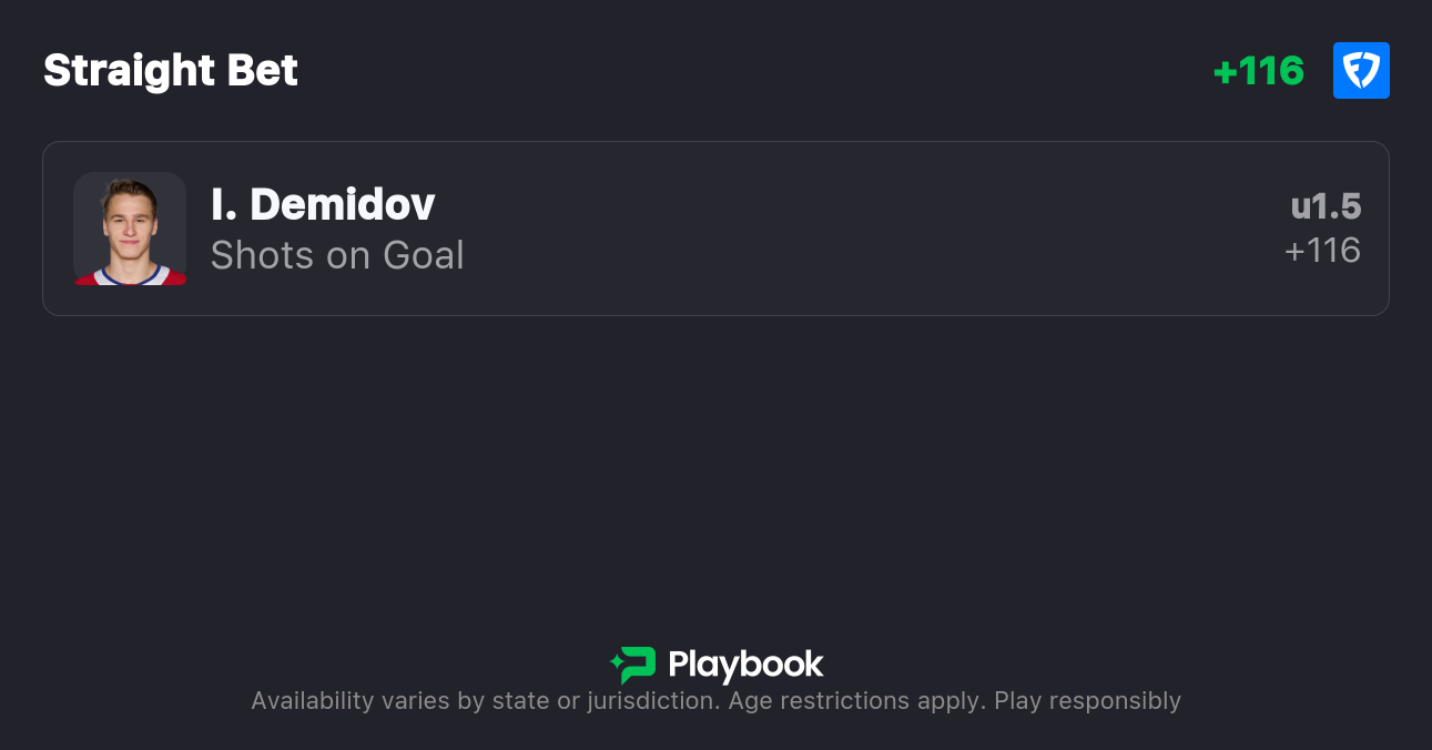 Best Bet: Ivan Demidov Under 1.5 Shots On Goal (+116, FanDuel)
