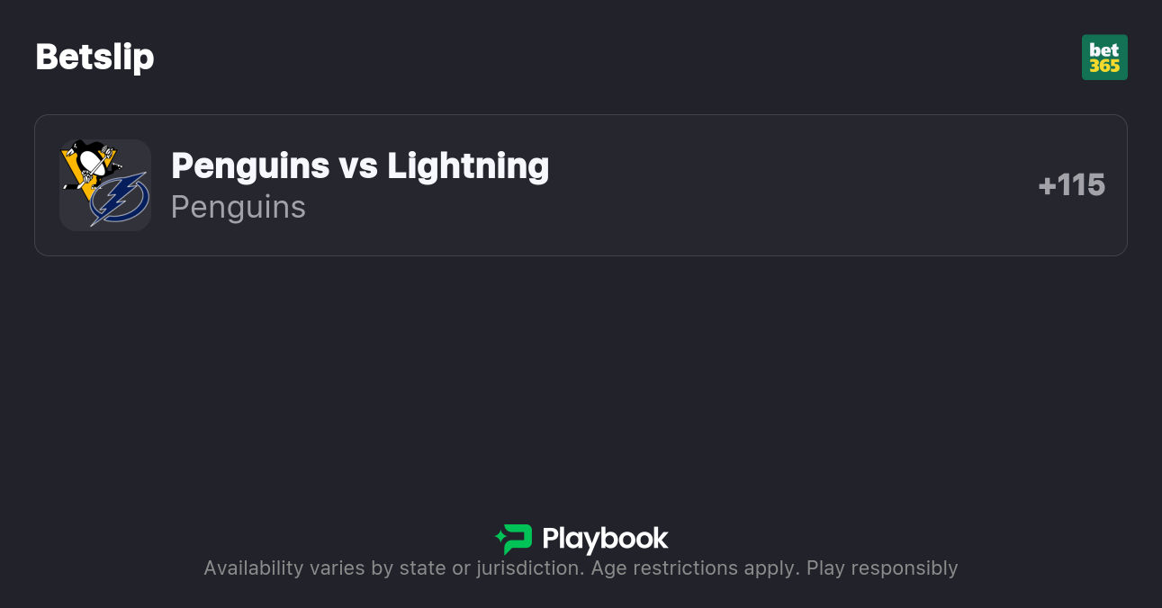 - Lightning vs. Penguins Moneyline: Lightning -135, Penguins +114