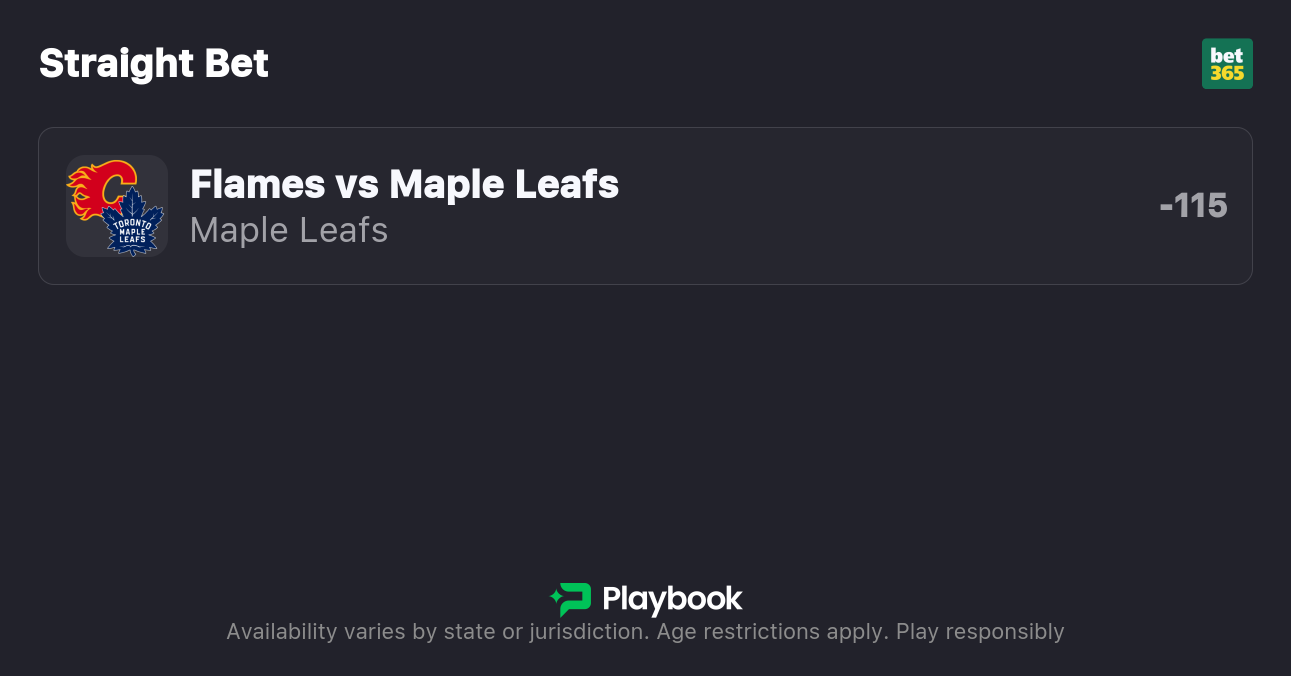 The Maple Leafs are favored by -1.5 on the puck line, with the over/under set at 6.5 (-100o / -120u). The Maple Leafs are a -115 favorite to win outright, while the Flames are -105 to pull off the upset.