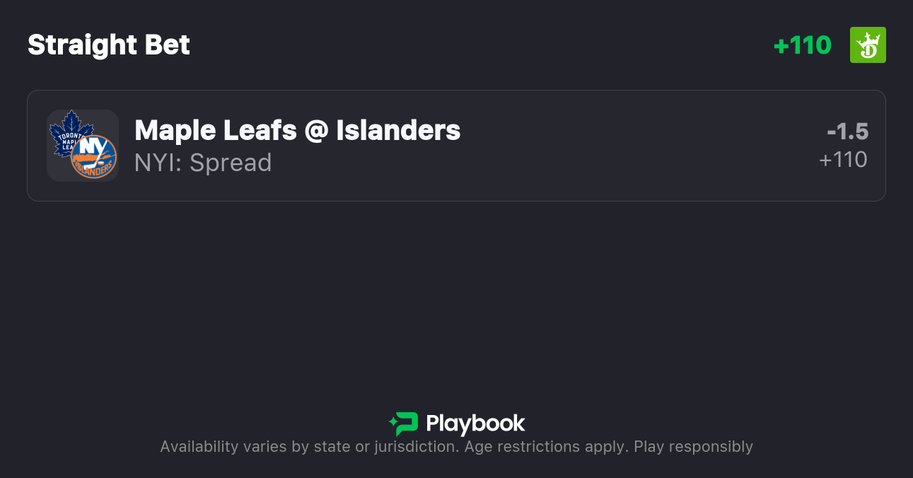 - Maple Leafs vs. Islanders Spread: Islanders -1.5 (+108 ), Maple Leafs +1.5 (-130)