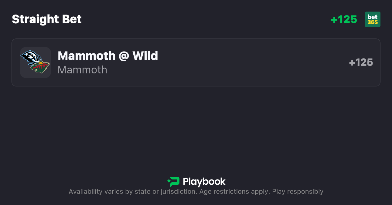 The Wild are favored by -1.5 on the puck line, with the over/under set at 6 (-110o / -110u). The Wild are a -150 favorite to win outright, while the Mammoth are +125 to pull off the upset.