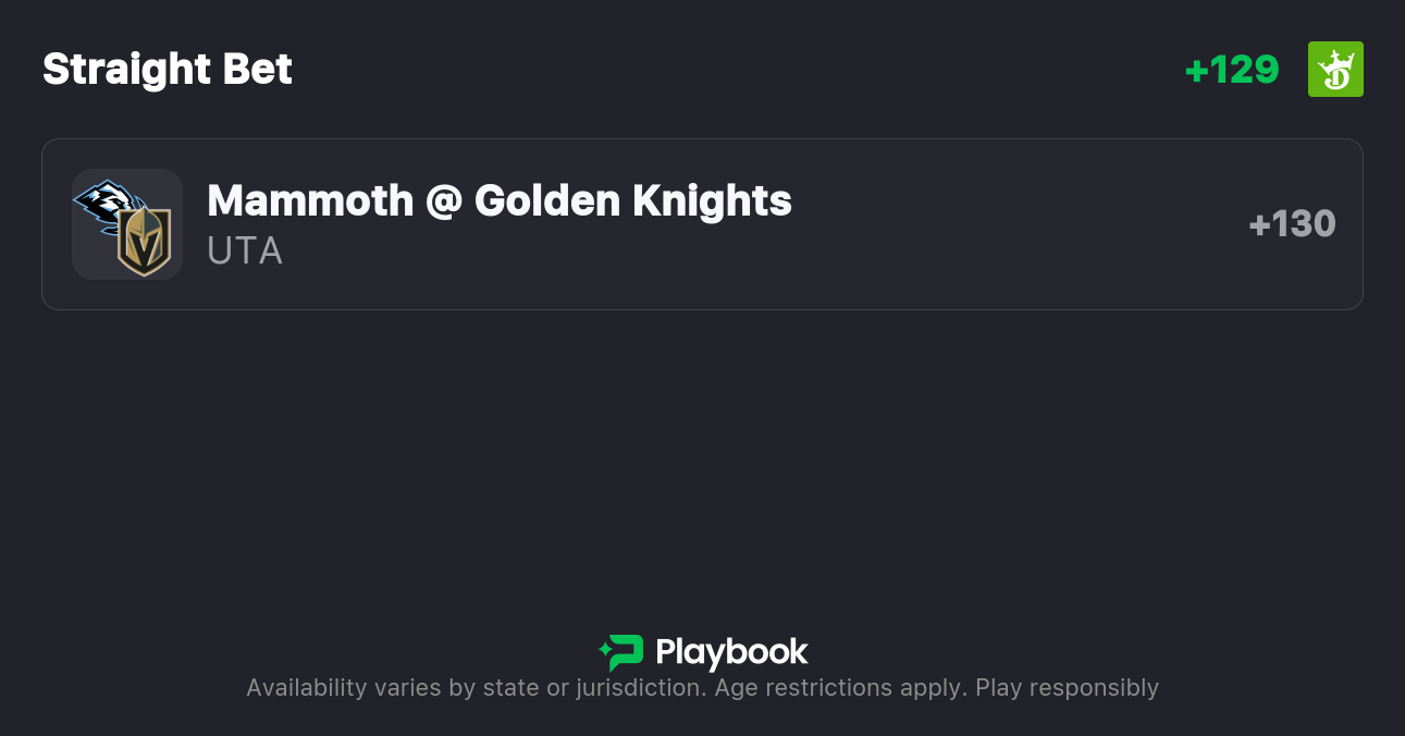 - Mammoth vs. Golden Knights Moneyline: Mammoth +130, Golden Knights -155
