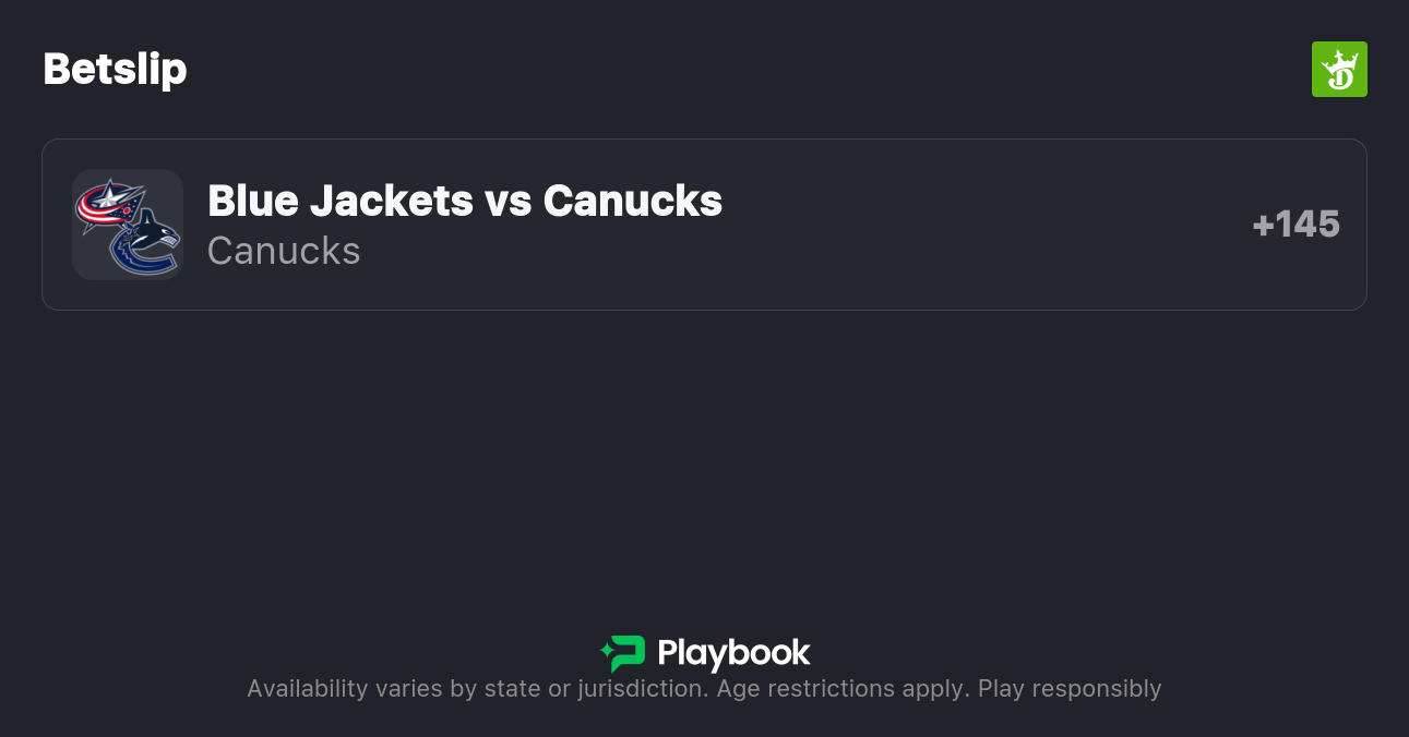 The Blue Jackets are favored by -1.5 on the puck line, with the over/under set at 6.5 (-115o / -105u). The Blue Jackets are a -170 favorite to win outright, while the Canucks are +142 to pull off the upset.