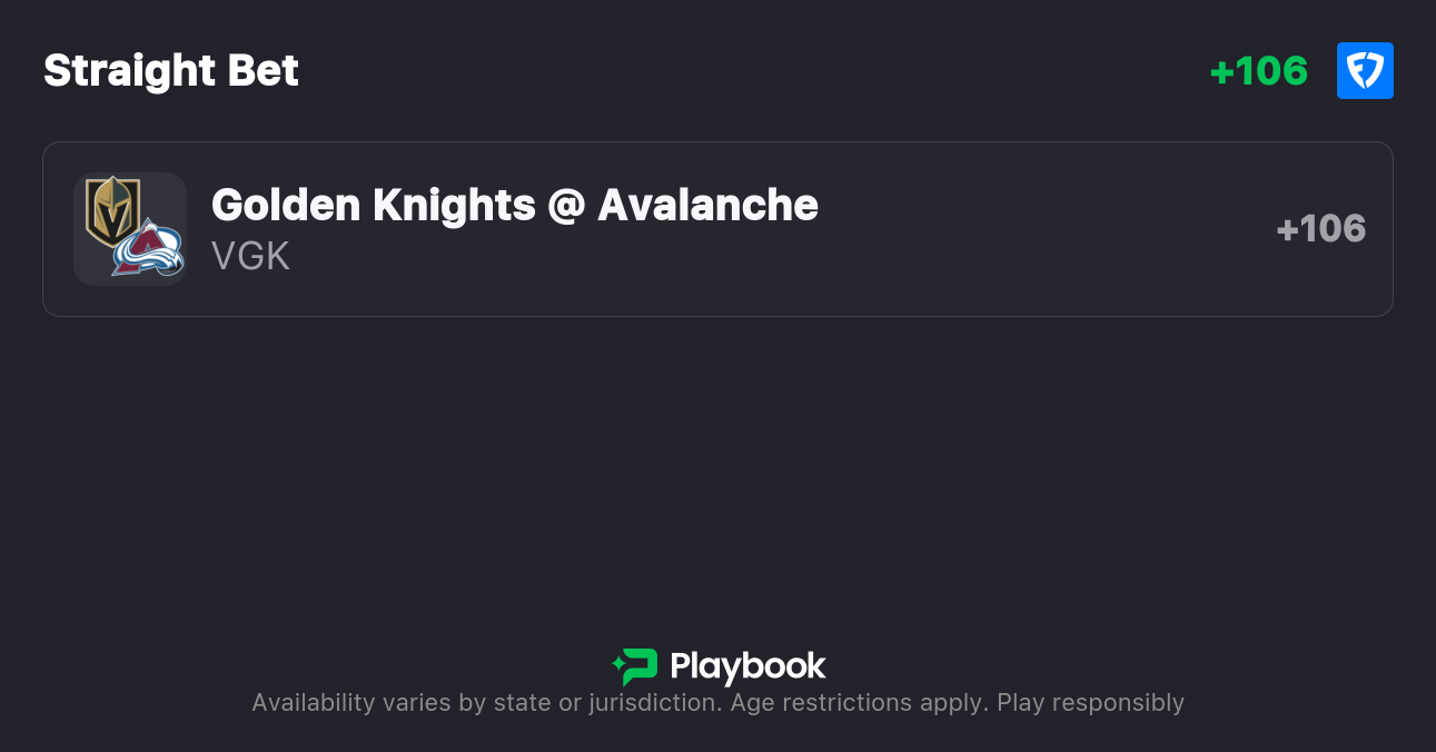 - Golden Knights vs. Avalanche Moneyline: Golden Knights +106, Avalanche -128