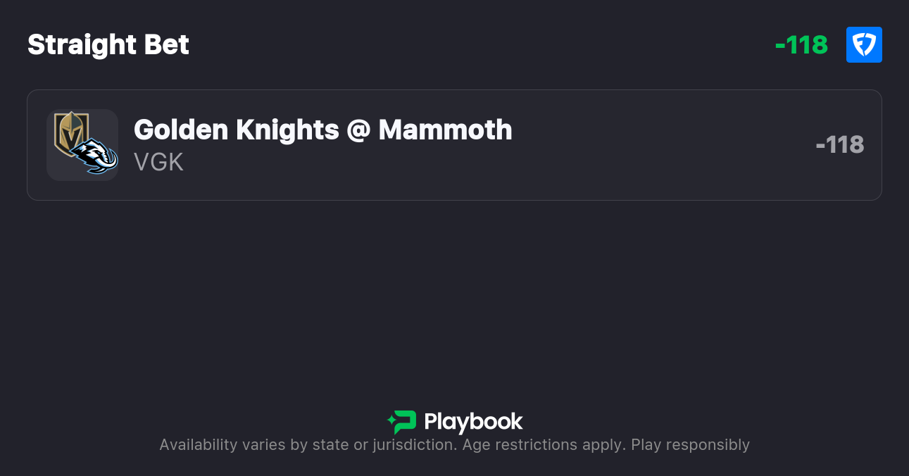 - Golden Knights vs. Mammoth Moneyline: Golden Knights -115, Mammoth -105