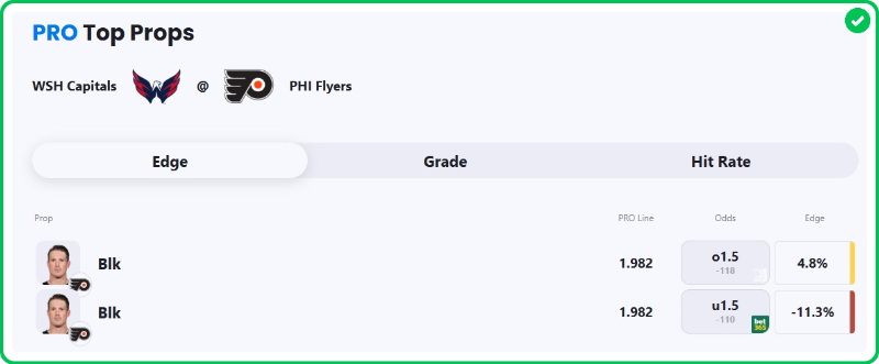 Action PRO projects Flyers defenseman Nick Seeler for 1.98 blocks against the Capitals tonight, giving us an interesting 4.8% edge against the market when compared to his current prop line of over/under 1.5.