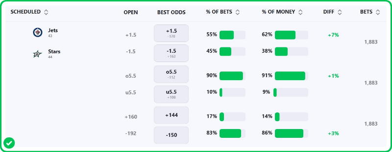 The Stars are favored by -1.5 on the puck line, with the over/under set at 5.5 (-115o / -105u). The Stars are a -160 favorite to win outright, while the Jets are +135 to pull off the upset.