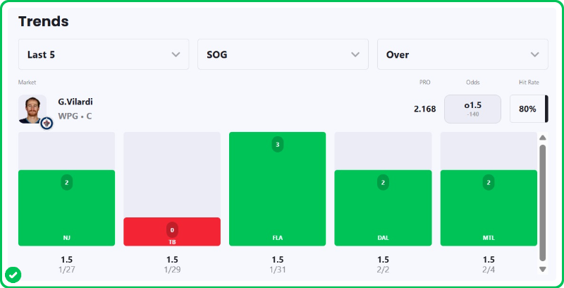 Vilardi has surpassed this line in his last three games and in four of the past five, with totals of 2, 3, 2 and 2.