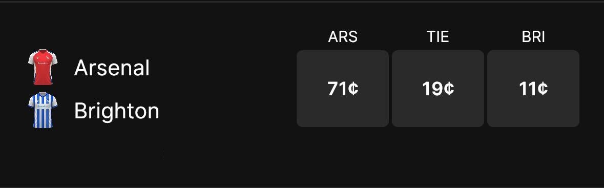 The over/under is set at 2.5 goals in this match. Arsenal is favored at a price of 71 cents, while Brighton is priced at 11 cents to win on Fanatics Markets.