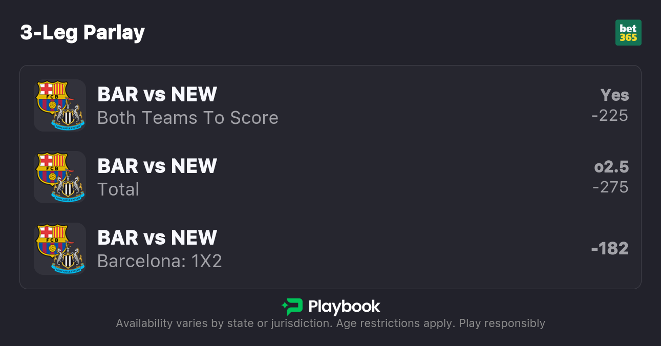 Our Newcastle vs. Barcelona best bet is a same-game parlay: the home team to win, both teams to find the back of the net and over 2.5 goals.