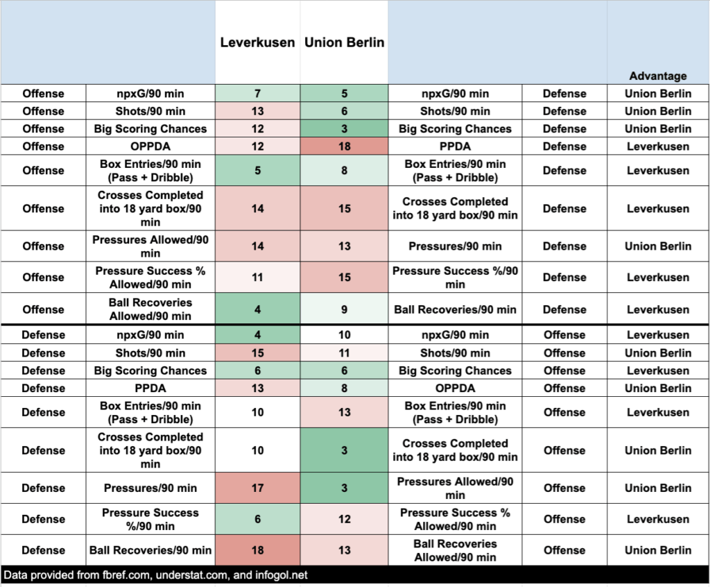 Even though Leverkusen has been drastically over-performing offensively, their defense has been rock solid allowing only 1.25 NPxG per match, per fbref.com.