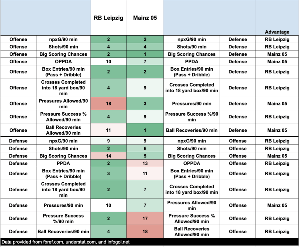 However, the three clubs they faced were Gladbach, Augsburg and Armenia Bielefeld, who are all in the bottom half of the Bundesliga table in xGA this season. Now, they’ll be facing the second-best defense in the league that's allowing only 1.12 xG per contest. Mainz has also conceded only nine big scoring chances, which is the best mark in the German first division.