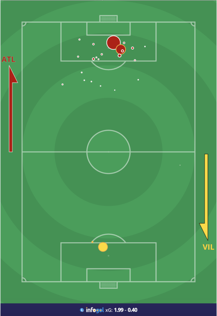 The first time these two clashed, Atlético Madrid thoroughly dominated Villarreal despite the 2-2 scoreline. Los Colchoneros won the xG goals battle by a 1.99-0.4 margin. In fact, Villarreal scored on their only two shots of the match, with Atlético Madrid outshooting them by a stunning 23-2 gap.