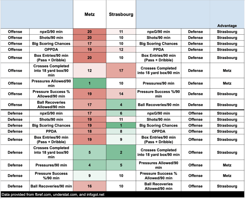 Even with them in the lineup, Metz has been one of the worst teams in France , especially on offense. The club is only averaging 0.83 NPxG per game, which is far and away the lowest mark in the French top flight. Metz is also averaging a putrid 10 shots and 6.4 box entries per 90 minutes, which rank last in France.