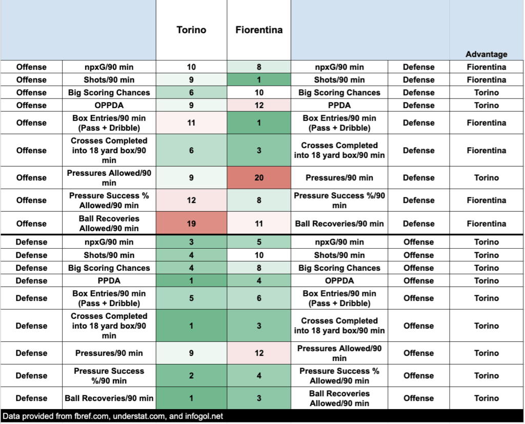 I can’t get over how good Torino’s numbers are this season, especially on the defensive side. They're only allowing 0.80 NPxG per match, 10.1 shots per 90 minutes and 9.5 box entries per game, all of which is top five in the league.