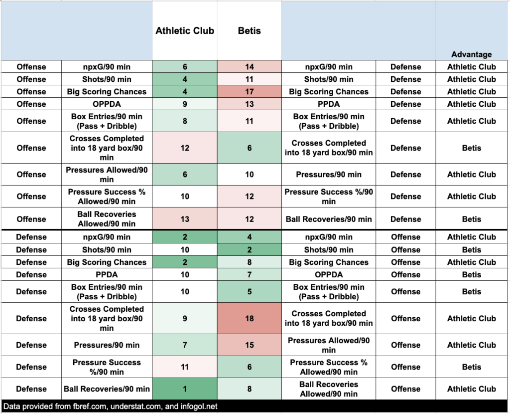 Real Betis’ defense has been very fortunate and really due for some negative regression, as they’ve only allowed 16 goals off 21 xG so far. They've also allowed 23 big scoring chances so far, which is the third most in La Liga, while Athletic Bilbao has created the fourth-most big scoring chances.