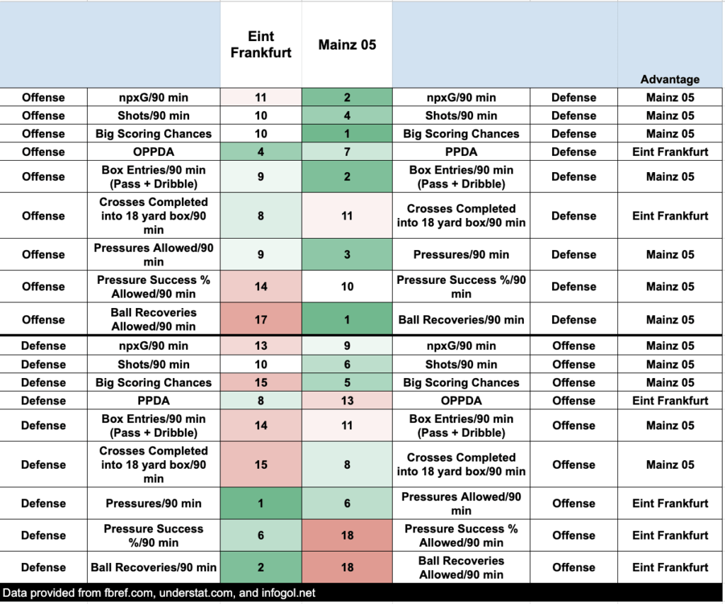 They’ll be going up against one of the best defensive outfits in Germany, as Mainz is second in NPxG allowed, third in shots conceded per 90 minutes and first in big scoring chances yielded with only nine conceded in 16 matches.