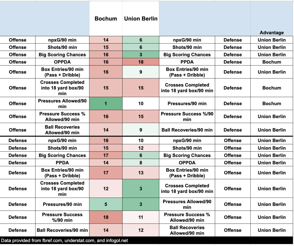 Union Berlin has been a pretty average offense all season long, ranking 10th in NPxG per match and 12th in shot per 90 minutes. However, they've created the sixth-most big scoring chances in the Bundesliga, so they should be able to create some high quality chances against Bochum's defense.