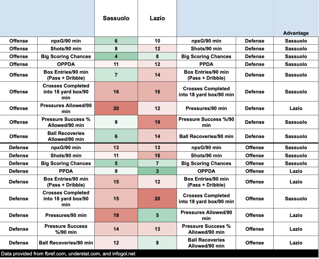 Sassuolo has been pretty good this season, creating 1.4 xG per match and has the fourth most big scoring chances in Serie A play. Lazio has been okay defensively, as they’re 10th in NPxG allowed, but they're one of the worst pressing teams in Italy. So, it’s going to be hard for them to win the ball against Sassuolo, who is top-six versus pressure.