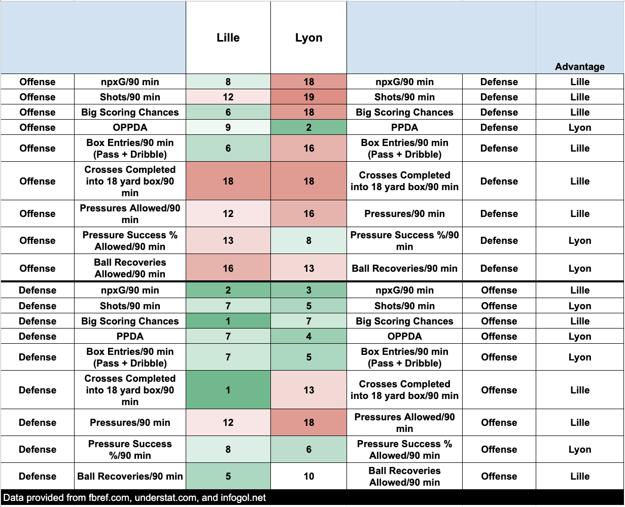 Lyon is allowing 1.74 xG per match and is bottom five in shots per 90, big scoring chances allowed and box entries. This past weekend they allowed a very average Bordeaux offense to create five big scoring chances.