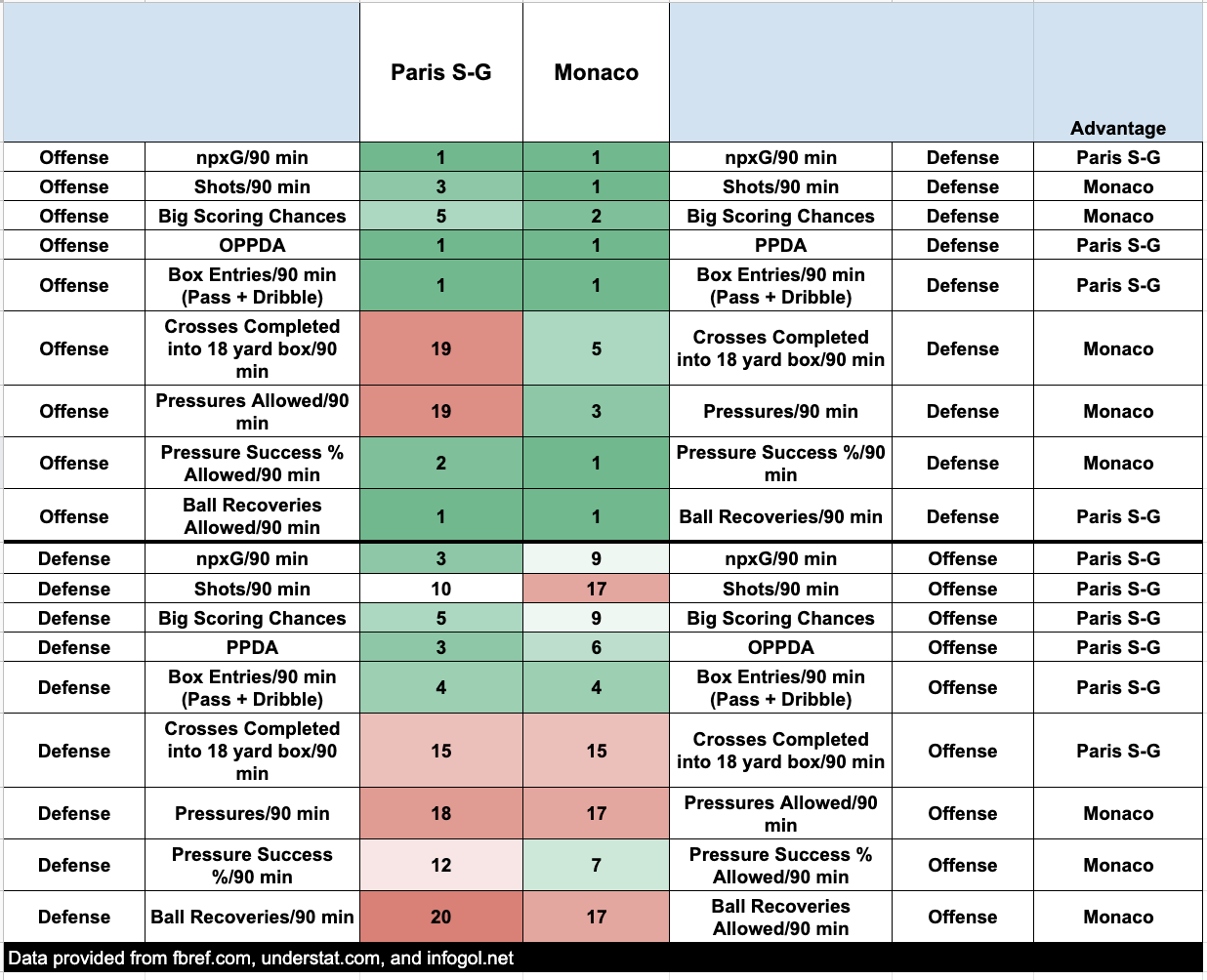 Even with how good Monaco's defense has been, the reason they're currently sitting in seventh place is because their offense has not been performing at an elite level. Monaco is only averaging 1.21 NPxG per match, which is ninth in Ligue 1. They're also 17th in shots per 90 minutes, so it's going to be difficult for them to create chances against PSG's defense.