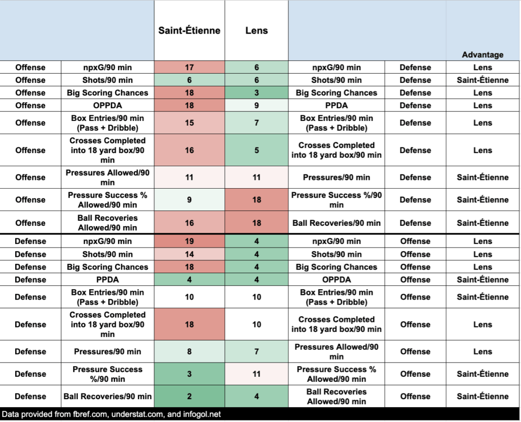In addition, Saint-Étienne is currently without five starters who are at the Africa Cup of Nations, including their top striker — Wahbi Khazri — who has 25% of their xG this season. If there's one positive to Saint-Étienne it's the fact they're one of the best pressing teams in the French top flight. They rank fourth in PPDA, third in pressure success rate and second in ball recoveries.