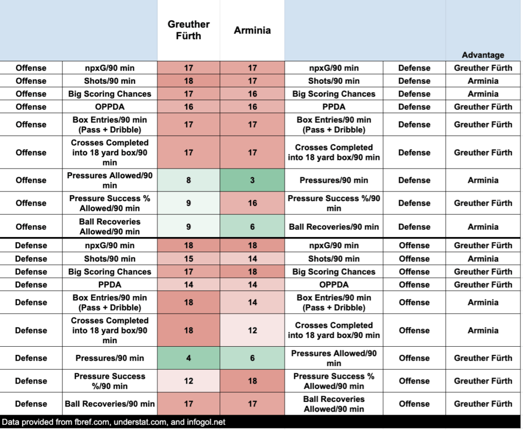 The reason Greuther Fürth is likely going to be providing value week in and week out is because ttheir goal differential of -36 seems isn't as bad as it seems. They actually have a -16.6 xGDiff, which is around only one xG behind this latest opponent in Arminia Bielefeld, who has a -15.2 xGDiff on the season.