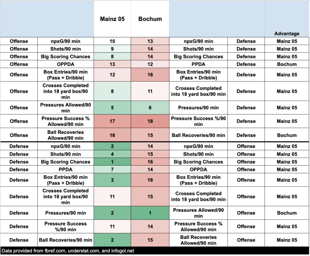 Now, they'll be facing a very below average offense in Bochum that's averaging only 1.00 NPxG per game and ranks bottom five in shots per 90 minutes and big scoring chances in the Bundesliga.