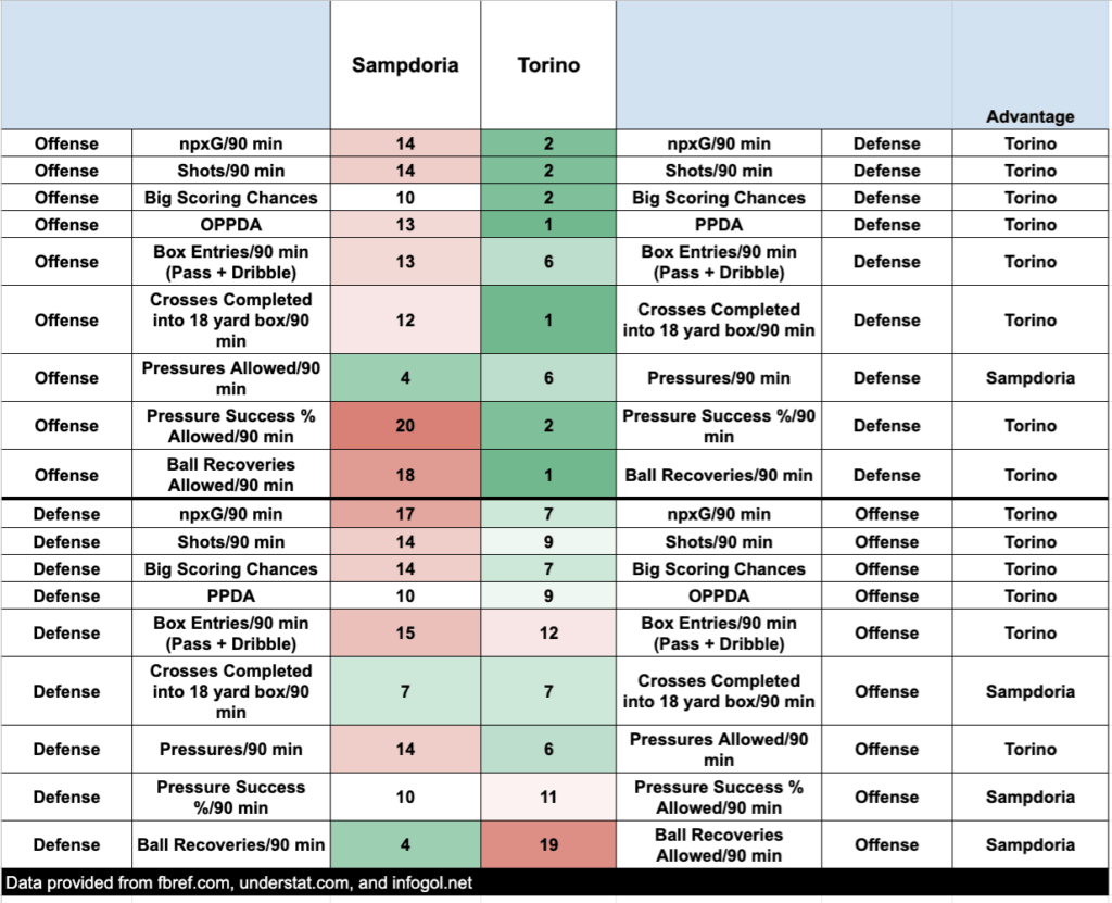 Torino is also one of the best pressing teams in Serie A, ranking first in PPDA, second in pressure success rate and first in ball recoveries. So, going up against a Sampdoria team that's dead last in pressure success rate allowed is a fantastic matchup.