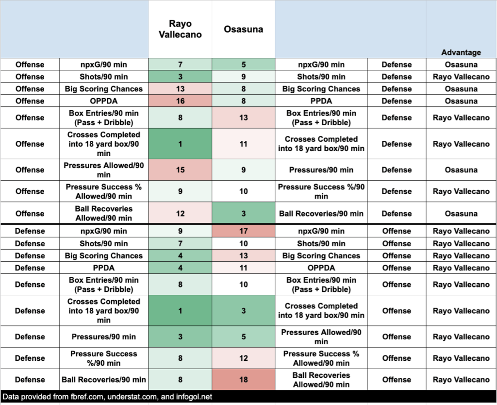 Additionally, a lot of where Osasuna creates their chances is down the flanks via swinging in crosses to the penalty area. Well, Vallecano is No. 1 in La Liga in crosses allowed in their own penalty area.